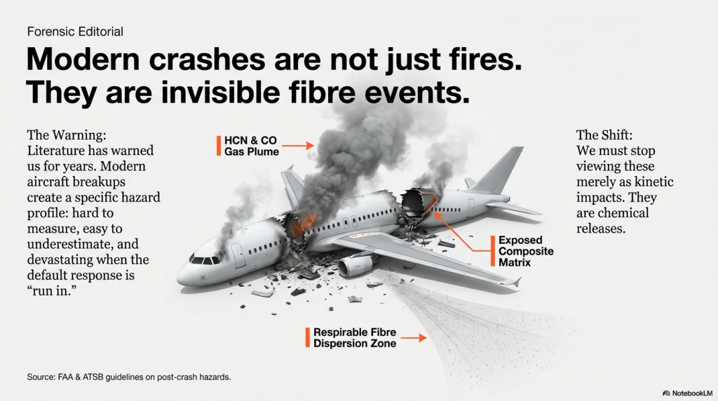 ATSB adds that shattered composite structures may produce respirable fibres, and splinters can be needle-sharp, irritating skin and eyes—while post-crash fire adds toxic gases and smoke.
