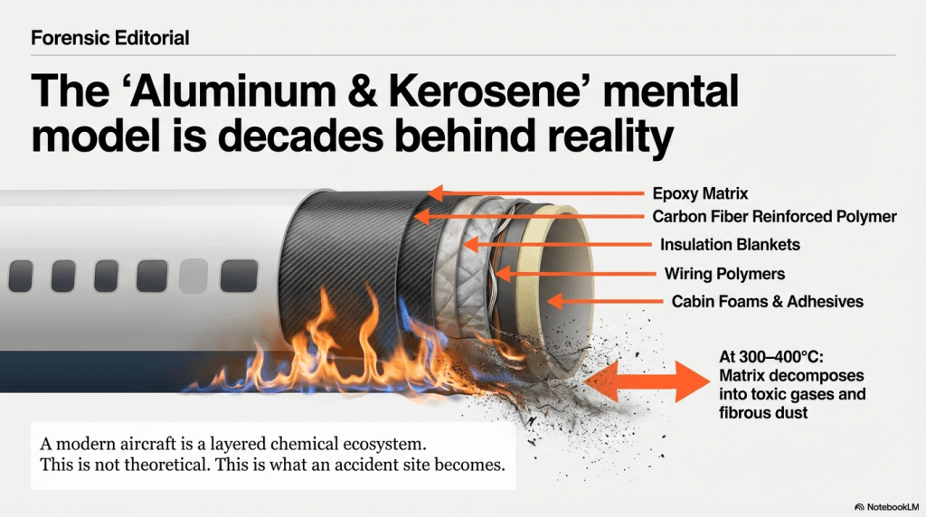 Aircraft accidents today are rarely “fuel + metal.” Modern airframes and cabins contain composite structures, epoxy matrices, insulation systems, wiring polymers, and foam furnishings. When these burn or thermally degrade, the smoke becomes a complex toxic environment, not merely a visibility problem.