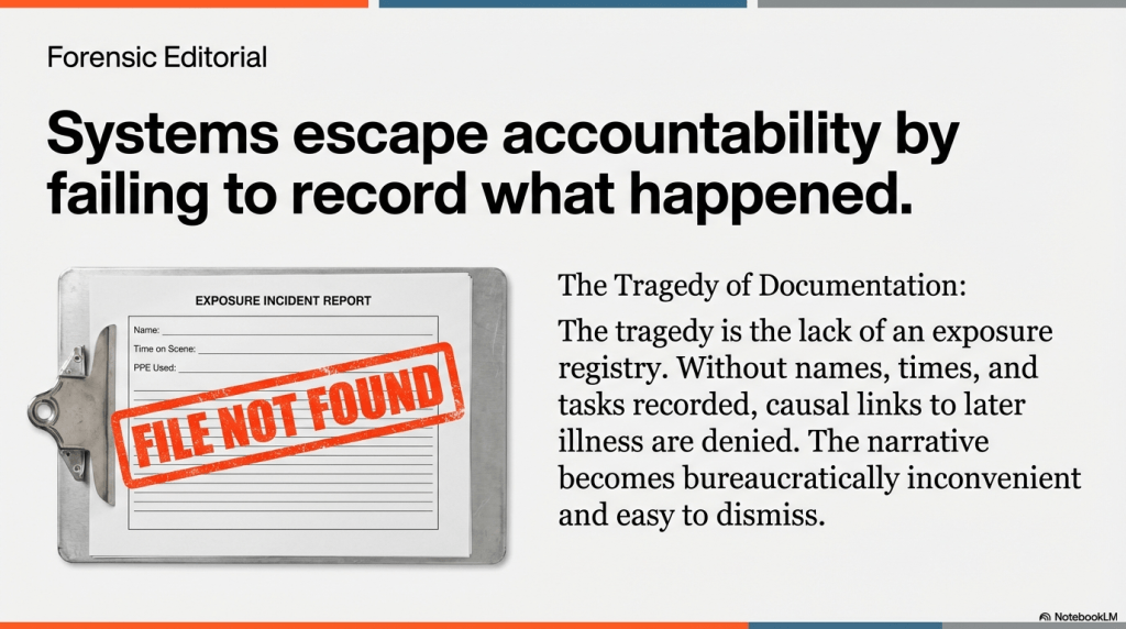 When exposures are undocumented, later respiratory, neurological, or dermatological symptoms become “unprovable” and therefore administratively ignorable. That’s how systems avoid responsibility: by failing to record what happened.