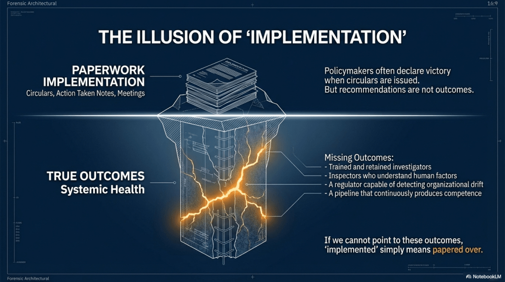 We have a national habit: when a tragedy happens, we respond with a flurry of circulars, meetings, audits, and “action taken” notes. Then we declare victory. We say: recommendations implemented, lessons learned, systems improved.
