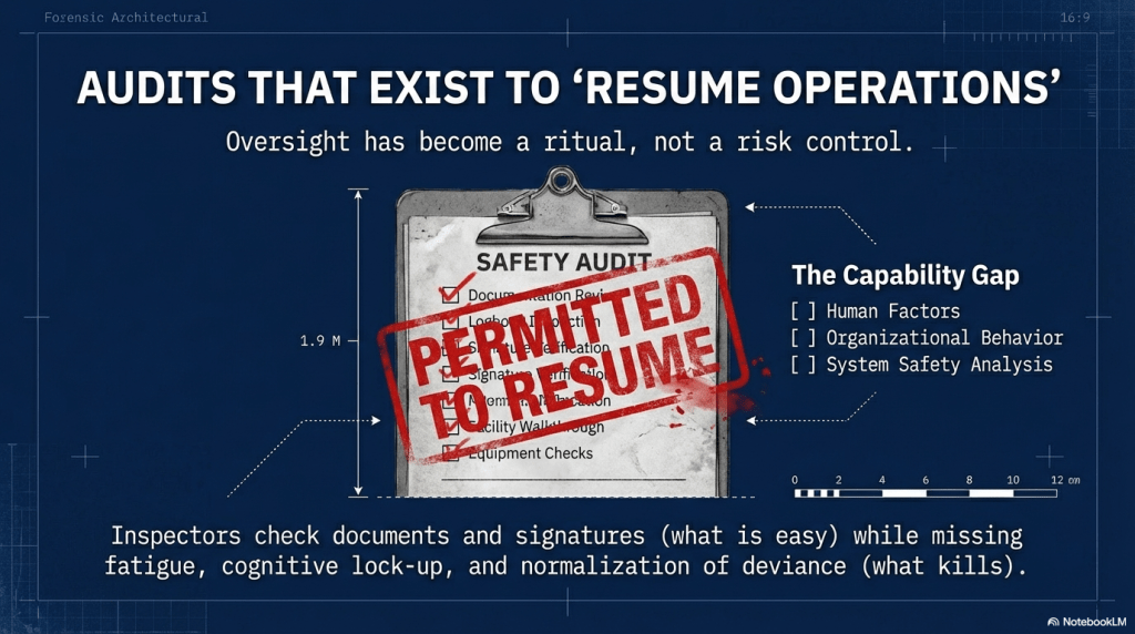 When audits become “restart certificates,” oversight turns into a ritual. And rituals don’t prevent accidents. Systems do.