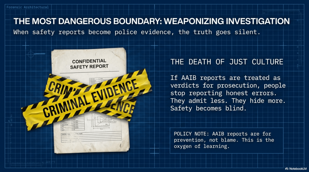 It argues that accident investigation outcomes are being treated as prosecutorial verdicts, and that police action often begins automatically, with AAIB (Aircraft Accident Investigation Bureau) reports treated as “final evidence.”