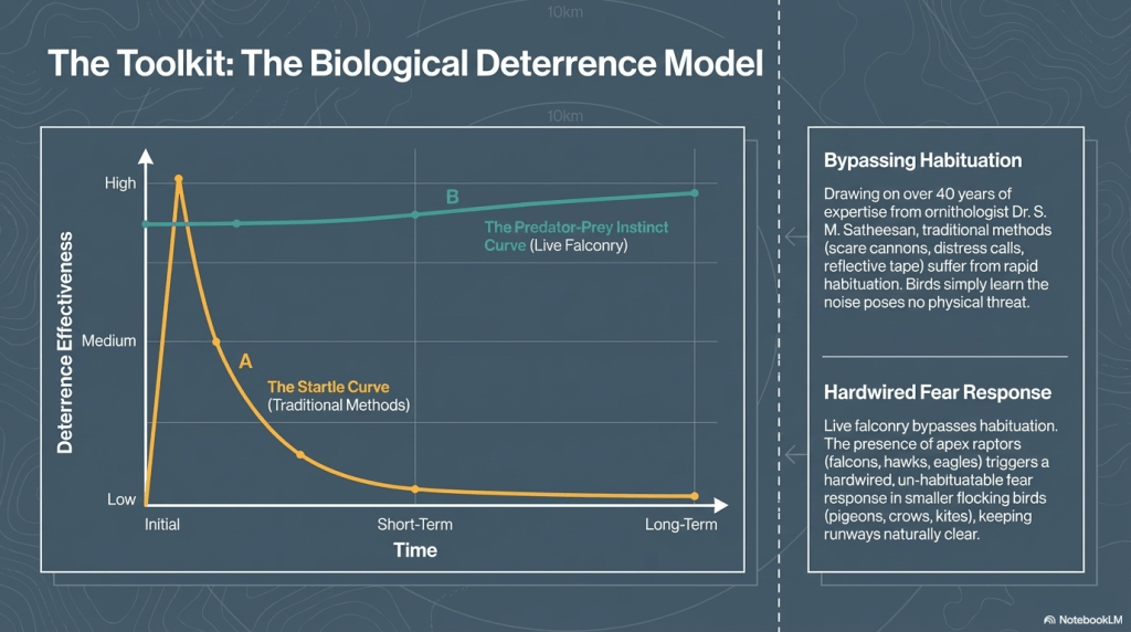 A falcon can disperse birds from a runway environment. It cannot remove an open garbage source. It cannot regulate illegal slaughter activity. It cannot fix stagnant water, unmanaged wetlands, or weak civic enforcement. Falconry is a sophisticated and useful tool, but it cannot compensate for a degraded urban ecology outside the airport boundary.