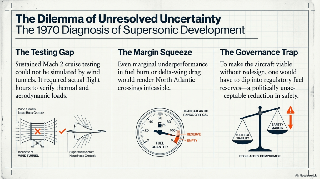 As contemporaneously observed by The Economist in May 1970—later entered into the U.S. Congressional Record by Representative Henry S. Reuss—Concorde faced a structural dilemma: its most critical cruise-speed trials had not yet been completed, yet political momentum discouraged any major redesign or delay.