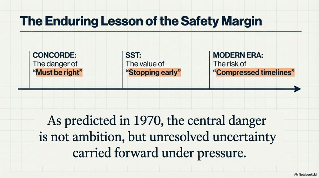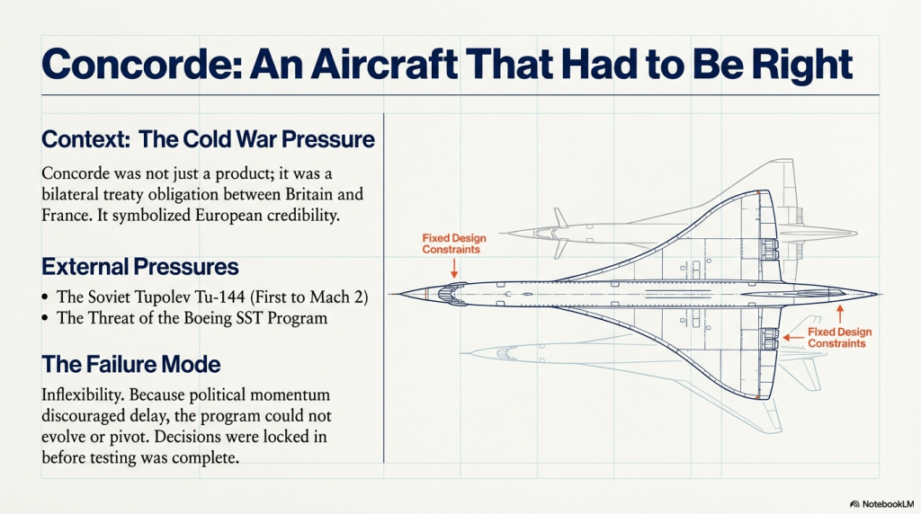 Concorde ultimately proved technically sound but commercially constrained. Its failure was not one of immaturity, but of inflexibility: once committed, it could not evolve.