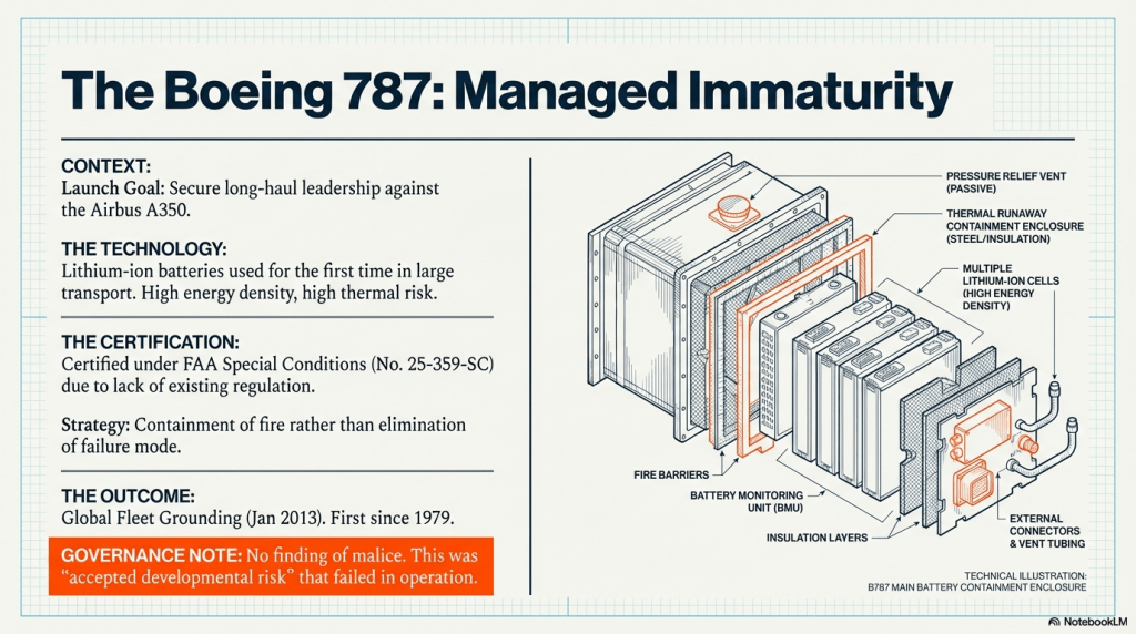 The 787 and 737 MAX demonstrate how modern competitive pressure can compress development timelines, requiring strong governance and transparency to prevent risk from migrating into service.
