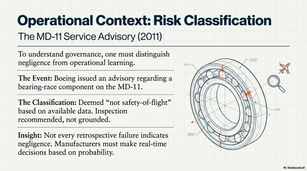 The NTSB has since referenced this advisory in the context of a later MD-11 accident investigation, noting that the earlier classification reflected the understanding available at the time. No final determination of fault has been issued as of the latest public record (Aviation Week, “Boeing Warned of MD-11 Part Failure Risk, 2011, NTSB Finds”).