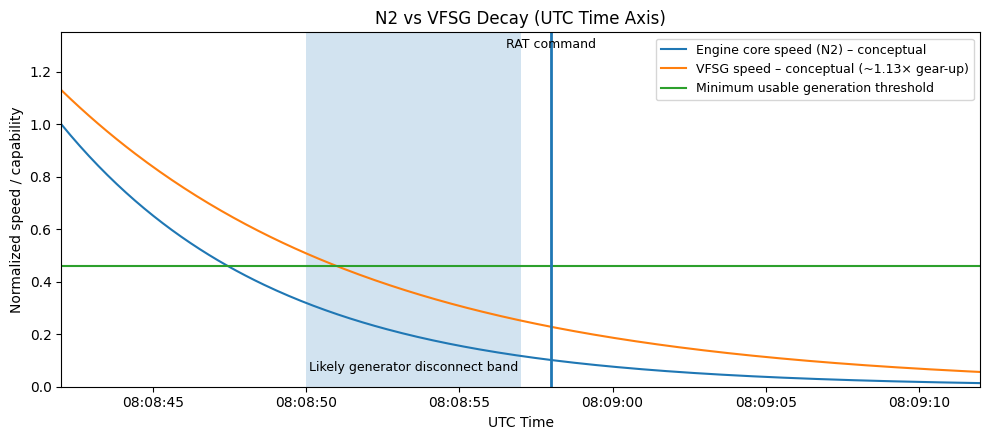 Figure 1 — Generator power decays after fuel cutoff, not at it After fuel cutoff at 08:08:42 UTC, engine speed decays gradually. Due to gearbox gearing, the generator (VFSG) remains above its minimum usable threshold well below idle. Generator loss therefore, occurs several seconds later, and only after that is the RAT commanded.