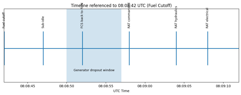 Figure 2 — Event sequence referenced to 08:08:42 UTC Fuel cutoff, generator loss, and RAT deployment occur in a fixed order dictated by physics and system logic. The RAT is commanded only after the generator output becomes unusable, regardless of pilot intent or subsequent switch position.