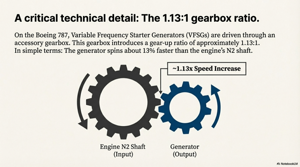 On the Boeing 787, the engines drive Variable Frequency Starter Generators (VFSGs) through the accessory gearbox. The commonly referenced minimum value of about 7400 RPM (≈370 Hz) applies to the generator rotor, not to the engine’s N2 shaft.