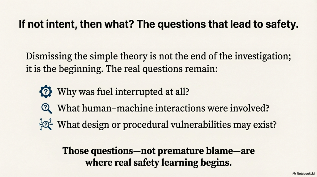 But aircraft are not designed around intuition. They are designed around physics, inertia, and deliberate delay. And when those are taken seriously, the timeline itself shows why the “pilot fuel cutoff” theory does not hold up — even if we assume fuel was cut.